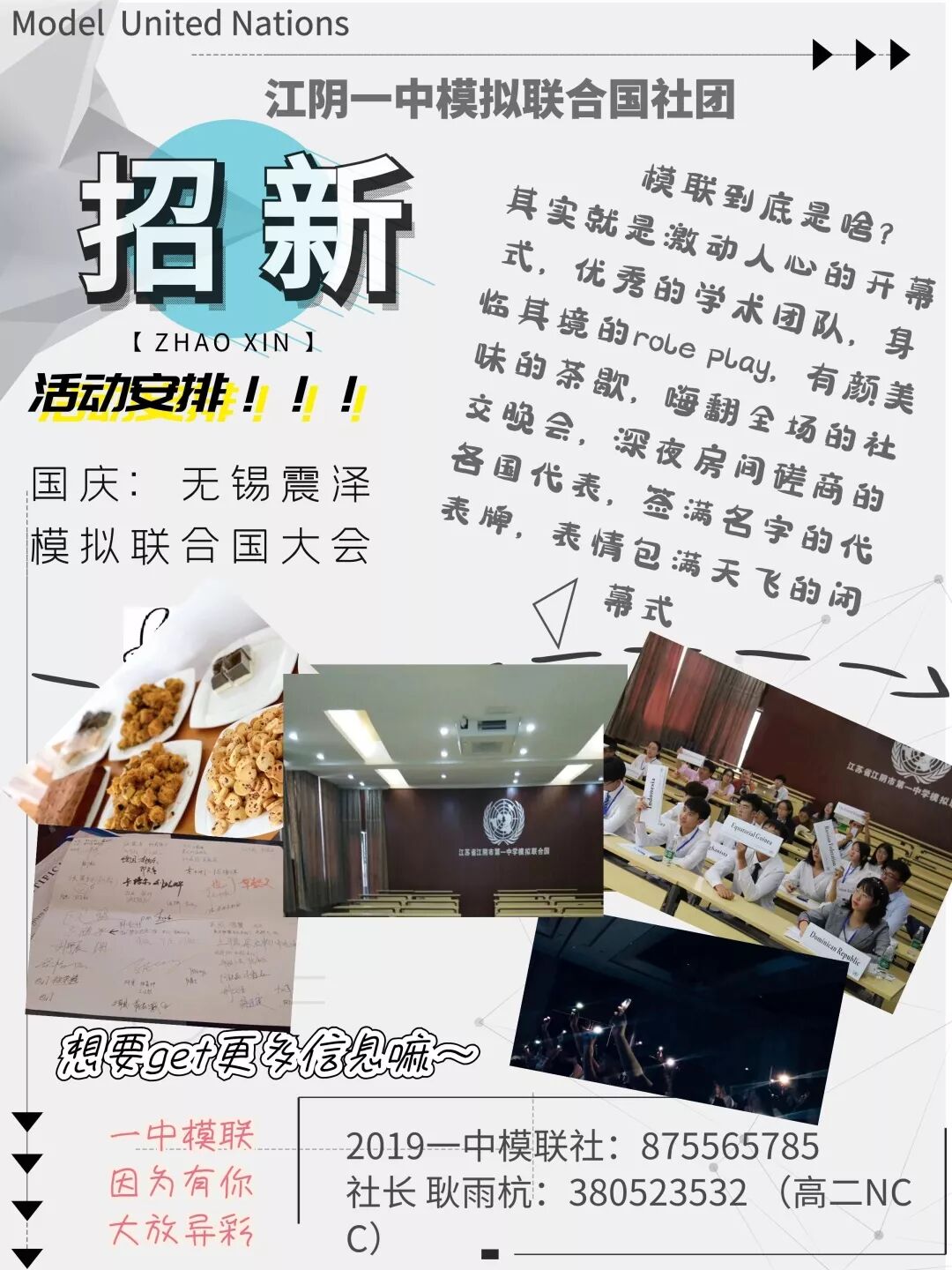 十月我们一起去天一 模联社社长:耿雨杭 Q1 招新安排 古语云:“天下兴亡,匹夫有责。”虽然身为学生,也要心怀天下。正是这份热诚,一中模联社已经走过了六个春秋。这几年里,我们一次次身着正装,高举国家牌,于会场上满腔热血,舌战群雄。纵使身处江湖之远,我们也要叹天下之忧,论庙堂之事。我们明白高举国家牌的那一刻,我就是在为国家而战。 Q2 了解模联 这两年,我校联合多校成功举办过3届模拟联合国大会,受到模联同仁的一致好评。我们也不断派出代表团前往全国各地交会不同地区的会议,上海、南京、杭州、苏州等地都留下了我们的足迹。在模联的路途上,面对天一、南京外国语、师大附中等高校学子,我们以青年之姿,矗立会场,令其牢记,于大千世界留下一中模联的印记。 Q3 报名方式 如今的世界,风起云涌,机遇与挑战并存。个人命运的发展是离不开国家和世界命运发展的趋势的,因此,我们都在为人类命运共同体挥洒青春。 每一场模联会,三天亦是四天的时间里,我们都沉寂在一场梦中,与一群志同道合的朋友,为同一个理想去奋斗,去拼搏。结识一群有意思的人,编织一场美丽的梦。 “我们叫它模联,美名曰其青春。” 且行且思,笔墨交锋。 六载模联,静候君至。 江阴一中模联欢迎您